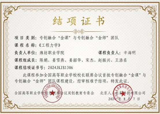 近日,全国高等职业学校校长联席会议双创教育专委会公布了首批专创融合“金课”与专创融合“金师”团队验收及认定名单,天行体育官方网站辛海明副教授主持的《工程力学》入选首批专创融合“金课”。 全国职业院校首批立项的370门“金课”课程,在“出彩课堂”线上平台经过两个学期的运行后,依据课堂互动效果、专创融合能力训练案例、课赛融合的学生参与率以及课程标准推广这四大遴选指标进行了建设和运行。最终,专委会遵循“重在建设、严把质量、...更多 -