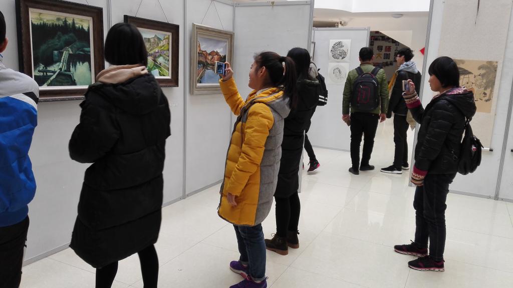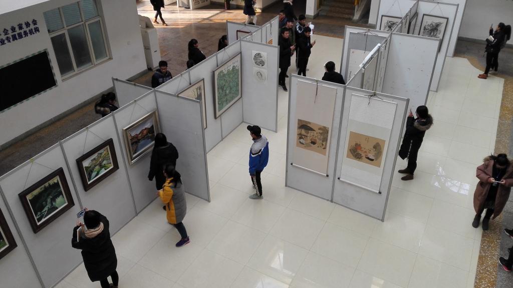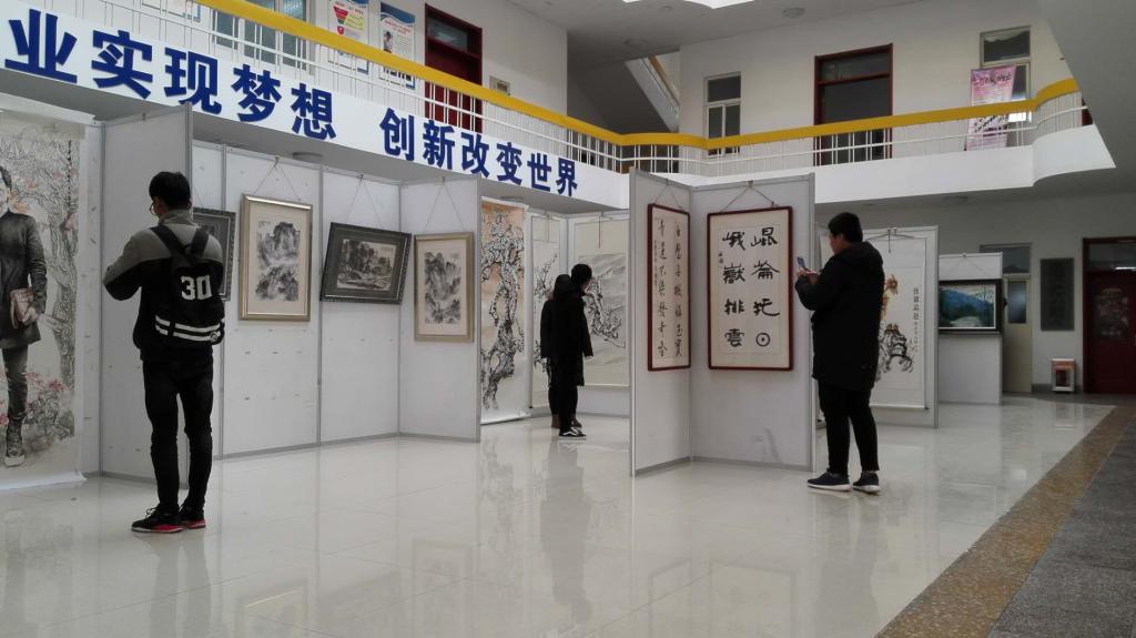 12月26日,由潍坊市美术家协会、天行体育官方网站文化创意天行体育官方网站、潍坊北海书画院、潍坊心连心公益书画院联合举办的“新时代·新征程”迎新年书画作品联展”在奎文校区大学生创业中心一楼大厅展出,展览至2018年1月12日结束。展览作品分为书法、国画、油画等多个板块,共60余幅作品,均是由我院教师和各书画院画家创作。