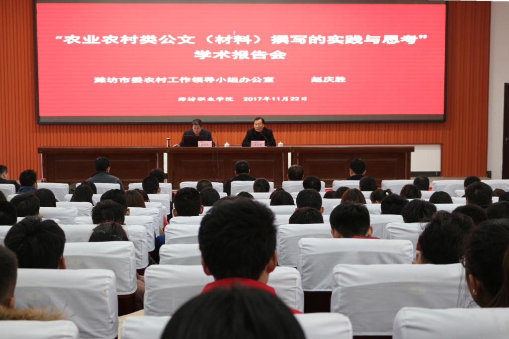 11月22日,我院邀请潍坊市委农村工作领导小组办公室赵庆胜副调研员在清泽楼报告厅作“农业农村类公文(材料)撰写的实践与思考”学术报告,副院长贺志强主持报告会,各职能部门教师代表、二级天行体育官方网站分管产学研工作人员及学生代表300余人聆听了报告。