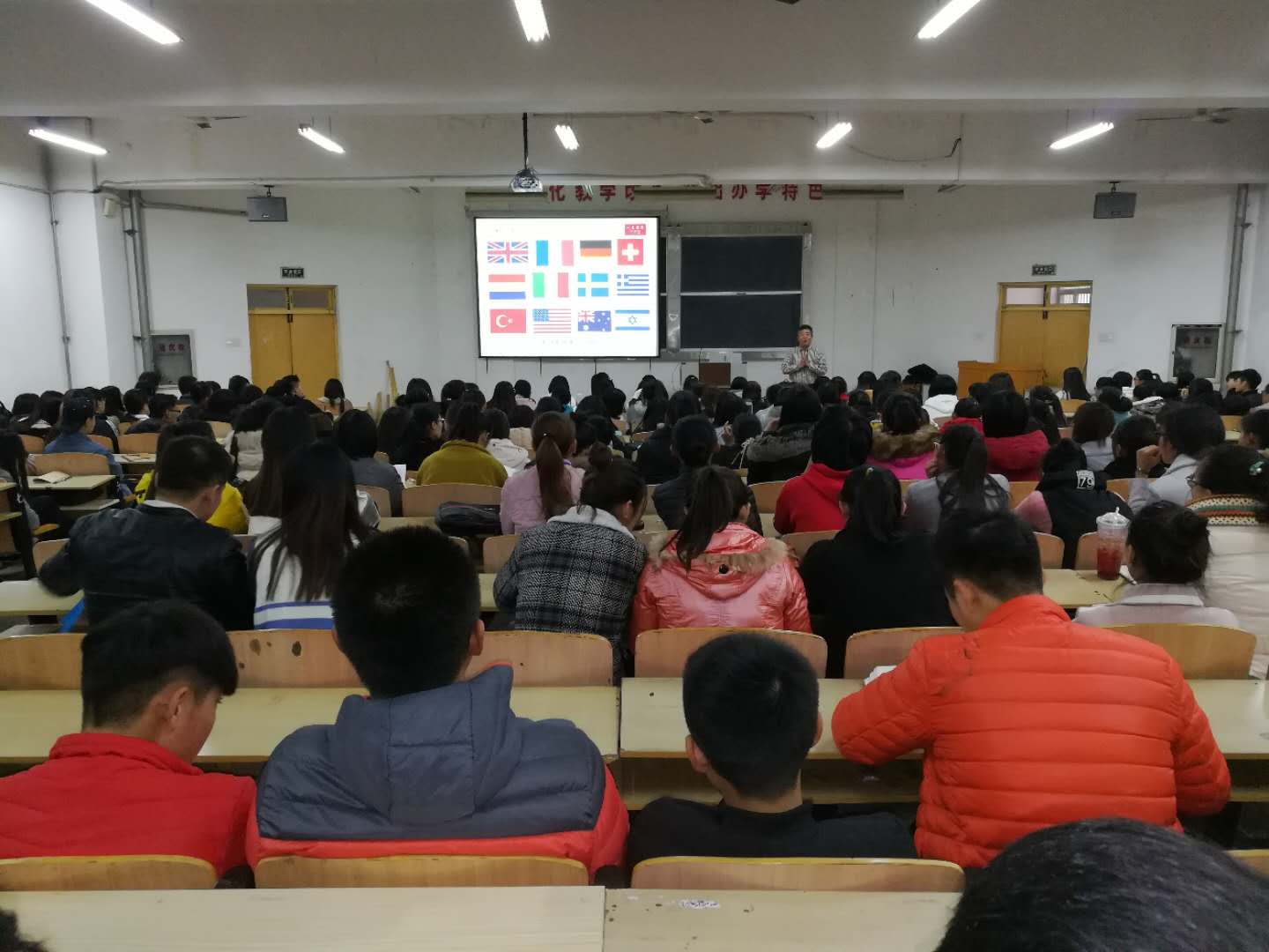 报告介绍了我国国旗国歌的来历和内涵,让同学们感受到了国旗国歌中饱含的强大的精神力量和坚韧的民族信念,展示了世界各国的国旗,聆听了有代表性的国歌,讲述了国旗国歌背后的故事,从英国的米字旗到美国的星条旗,从瑞士的方形旗到德国的三色旗,从雄壮激烈的法国国歌《马赛曲》到具有民族特色的俄罗斯国歌《我们神圣的祖国》,从彼得大帝到拿破仑,主讲人结合自己的切身经历,激情澎湃地为大家呈上了一场视觉和听觉盛宴。