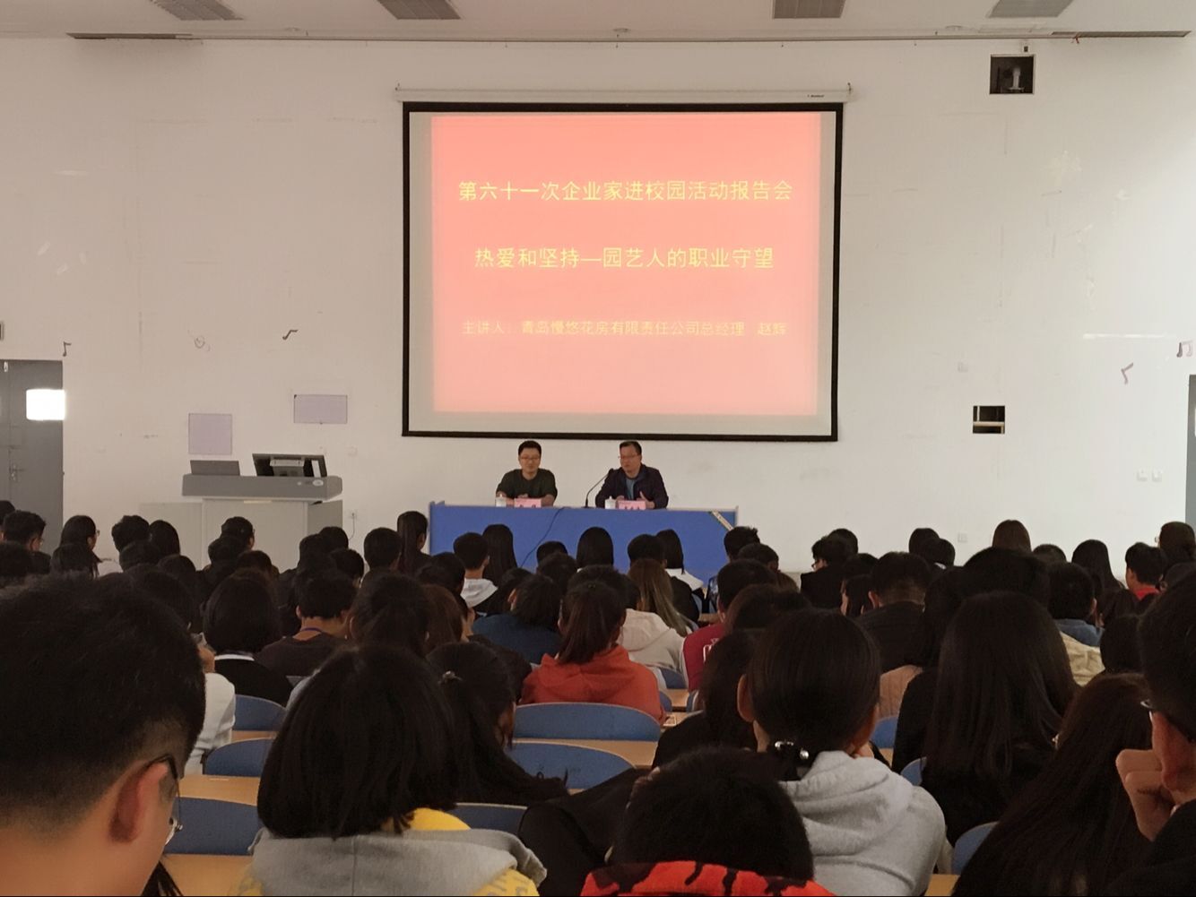 10月26日下午,天行体育官方网站第六十一次“企业家进校园”活动报告会在滨海校区惠泽1号楼报告厅举行。青岛慢悠花房有限责任公司总经理赵辉作了题为“热爱和坚持—园艺人的职业守望”的报告。科技处与农林科技天行体育官方网站师生参加报告会。