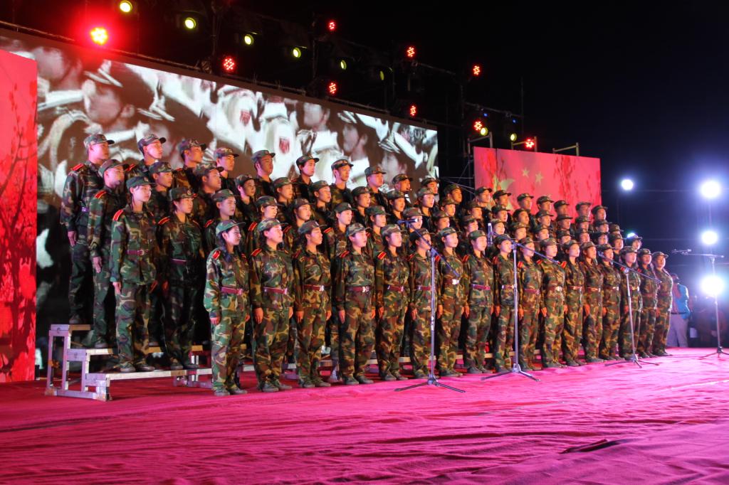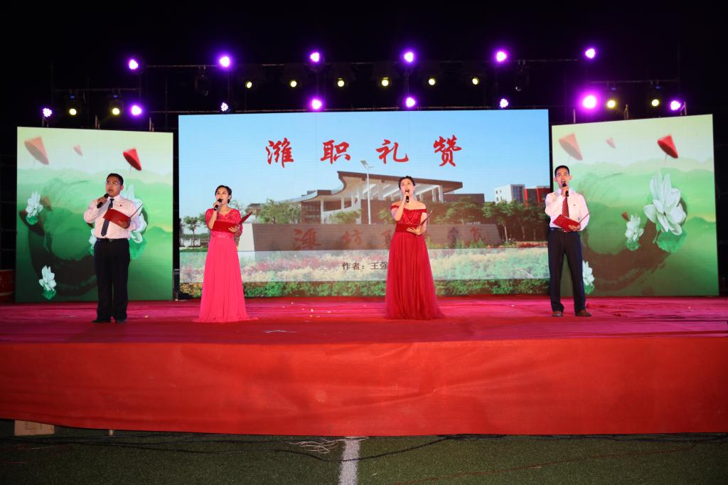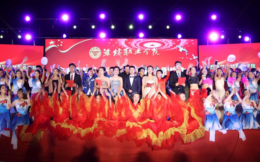 迎新晚会在气势磅礴的开场舞《鼓舞》中拉开了序幕。党旗飘扬,军歌嘹亮,两校区分别以《中国人民解放军军歌》、《强军战歌》、《走向复兴》、《四渡赤水出奇兵》军歌大合唱向在90年峥嵘岁月、砥砺前行的中国人民解放军致敬。随后的歌舞《国家》以跌宕的旋律,欢快的音调、昂扬的斗志和绚丽的舞姿,传递出师生对家与国真挚深切的体味;《美丽中国梦》唱出了中华民族的沧桑历程,歌颂了中华民族开创美好未来的非凡壮举;朗诵《少年中国说》展现出潍职学子的蓬勃朝气、赤子情怀;舞蹈《那些没必要想起,但绝不能忘记的岁月》鼓励大家让逝去的岁月在回忆里沉淀,歌伴舞《奔跑》、《娱乐天空》、拉丁舞《梦幻青春》、现代舞《D ance Crew》展现了潍职学子的青春活力,歌曲串烧《潍职好声音》点燃了现场的激情,相声《微微一信》逗得观众捧腹大笑,男女生四重唱《潍职版南山南》、朗诵《潍职礼赞》带大家领略了潍职的美妙,情景剧《父亲的散文诗》引起了大家对父亲的思念,乐队《平凡之路》、《像飞一样自由》用动感的旋律将现场气氛推向了高潮。