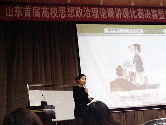 山东首届高校思想政治理论课教学比赛决赛日前落下帷幕。我院思想政治教学部教师周娉与全省高校思想政治理论课优秀教师同台竞技,取得形势与政策组全省第二名的优异成绩。