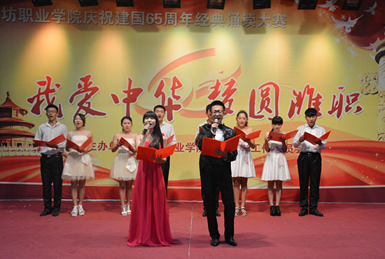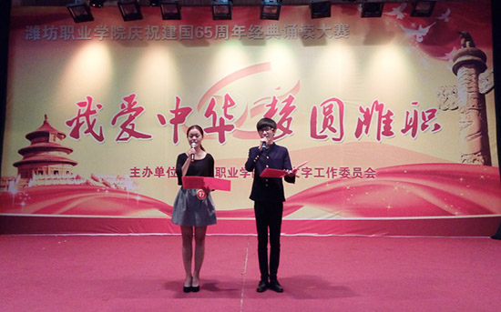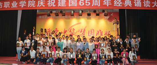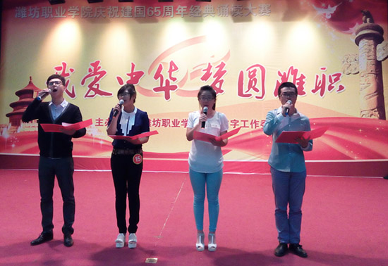 为庆祝新中国成立65周年,歌颂祖国建设取得的伟大成就,9月23日和26日,由天行体育官方网站语言文字工作委员会主办的“我爱中华·梦圆潍职”庆祝新中国成立65周年经典诵读大赛分别在滨海和奎文校区举行。来自全院9个二级天行体育官方网站的63个节目参加了最后决赛。经过激烈竞争,大赛最终评出一等奖5个、二等奖10个、三等奖20个。