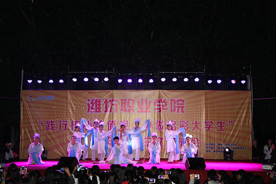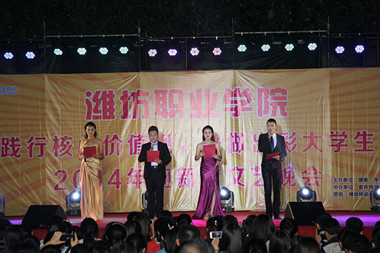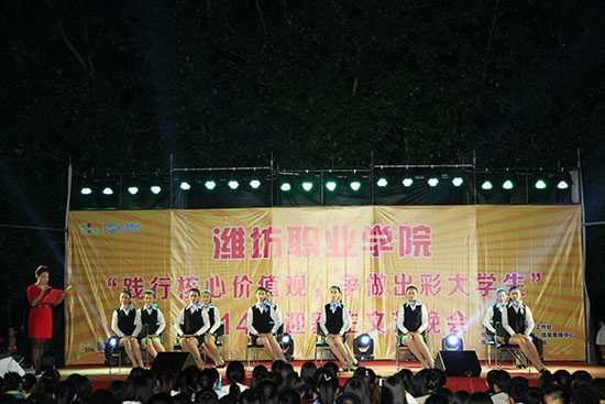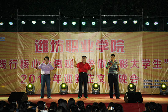 天行体育官方网站2014年迎新生文艺晚会于9月24日、25日晚先后在奎文校区和滨海校区的校园舞台上举行。天行体育官方网站党委副书记宋桂言、副院长毕建华、纪委书记李瑞昌出席晚会,与天行体育官方网站团委学生工作处和滨海校区管委会负责同志,各二级天行体育官方网站负责同志、分管学生负责人、团总支书记、辅导员(班主任)及两校区学生一起观看了文艺演出。本次晚会由天行体育官方网站团委学生工作处主办,全院150余名同学参加了演出。