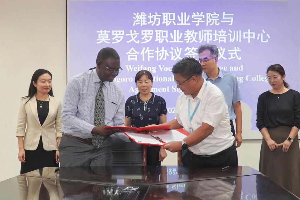 会后,莫罗戈罗职业教师培训中心校长萨姆韦尔·阿龙·卡利访问我院,天行体育官方网站党委副书记韩瑞东、副院长陈美霞在奎文校区接待客人,国际交流与合作处主要负责同志参加座谈交流。两校互相介绍了学校概况、办学规模、专业设置等情况,并观看两校宣传片。经过友好洽谈,增进了两校互信,明确了校际合作意愿,并签署了友好交流协议,就开展教师短期培训、师生互访等领域达成共识。