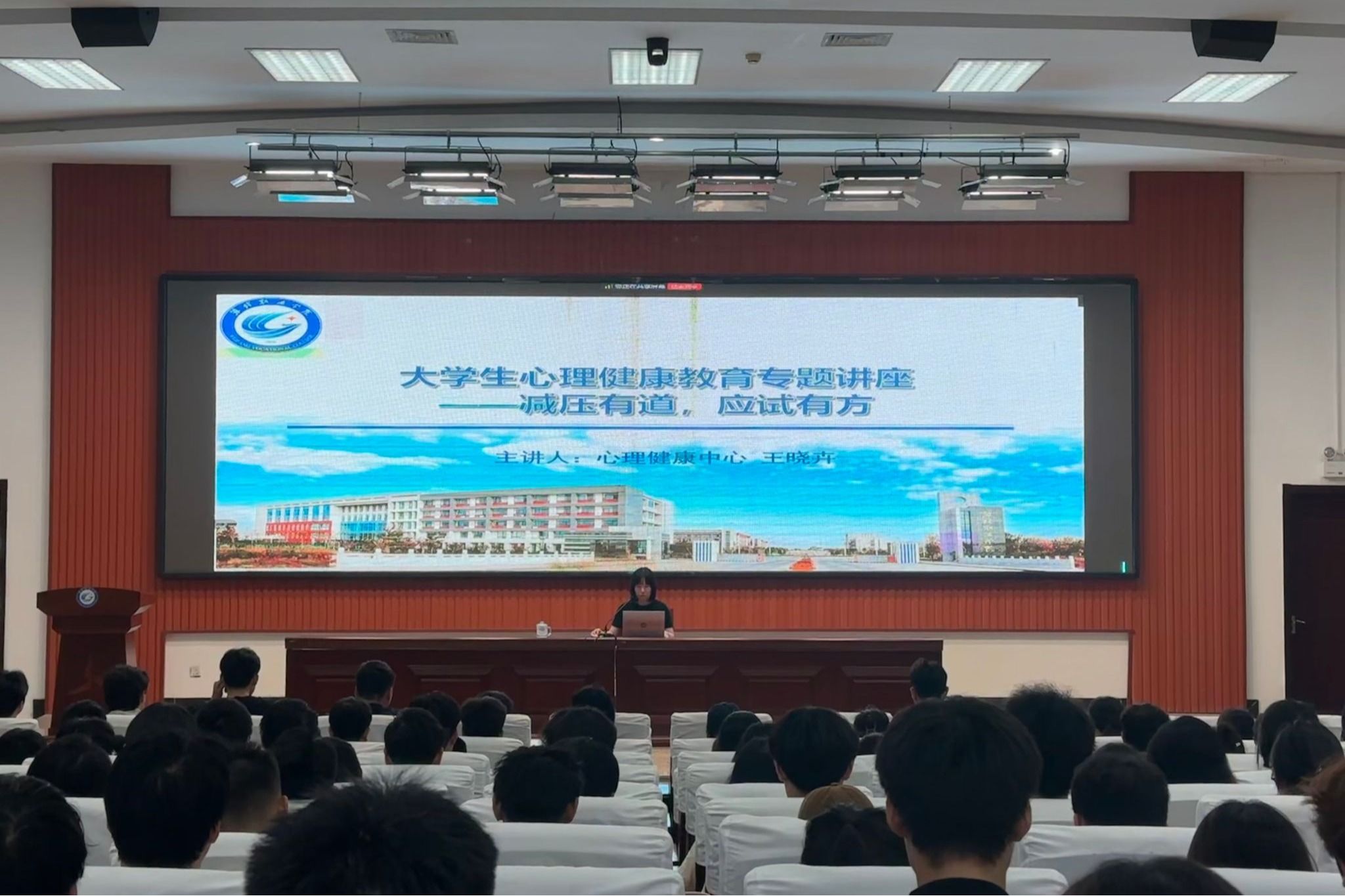 讲座聚焦三大核心内容:一是科学认知压力,破除焦虑误区。王老师通过压力自评量表引导学生客观分析自身状态,剖析学业压力等常见心理困扰,强调“适度环境压力是成长催化剂”。二是实战技巧赋能,构建减压工具箱。针对考前焦虑,王老师现场示范“肌肉渐进式放松”等实用技巧。三是应试心理建设,王老师提出“时间管理四象限法则”,并鼓励学生建立“社会支持网络”,倡导同学间开展“互助减压小组”活动。