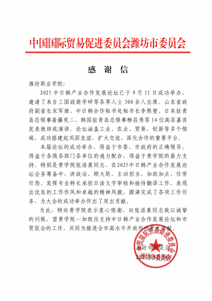 近日,中国国际贸易促进委员会潍坊市委员会发来感谢信,充分肯定我院在2025中日韩产业合作发展论坛中的贡献。论坛于9月11日成功举办,以“开放包容,合作共赢”为主题,吸引中日韩三国300余位政商学研代表参会,搭建工业、农业、贸易等领域的国际交流平台。我院主动对接区域需求,以“校地命运共同体”理念为引领,选派教师深度参与论坛筹备工作,为论坛注入“潍职智慧”。