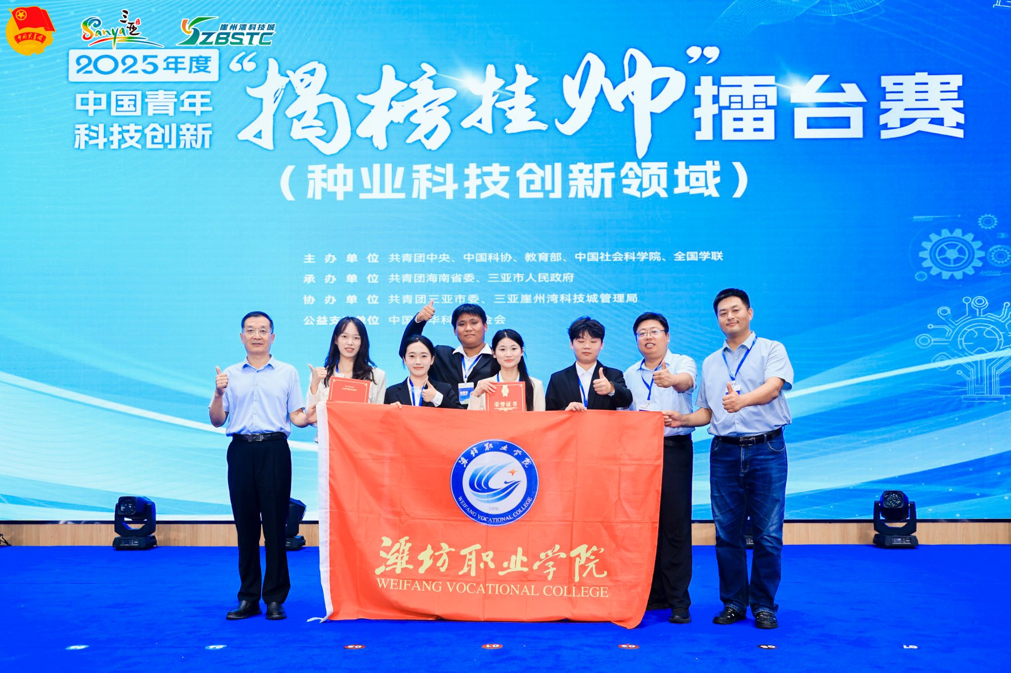 佳绩的背后,是师生团队近两年的深耕与坚守。备赛期间,师生团队深入实验室、试验田,反复优化方案、验证数据,每一个环节都凝聚着团队的智慧与汗水。天行体育官方网站团委召开推进会议,调度部署大赛工作,先后多次邀请天行体育官方网站领导、竞赛专家等对参赛项目进行指导,对参赛项目材料百余次修改、优化提升。比赛期间,学生团队沉着应战、敢打敢拼,以其显著的创新性和应用潜力赢得评委高度认可,充分展现了“崇实尚行 敢于争先”的潍职精神。