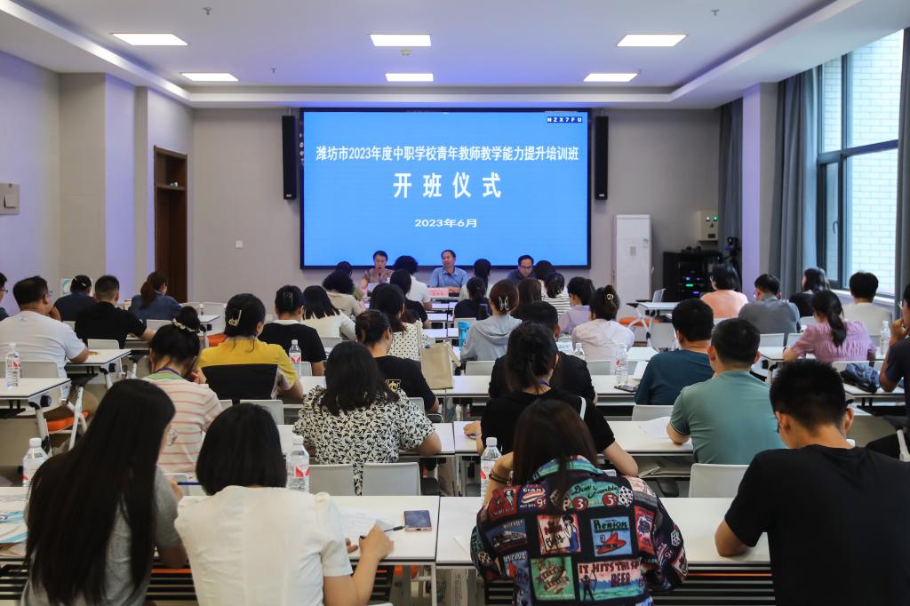 6月28日,潍坊市2023年度中职学校青年教师教学能力提升培训班在我院举行。天行体育官方网站领导李瑞昌、潍坊产教融合研究院副院长马玉才出席开班式并讲话,教师工作部主要负责同志主持开班式,来自潍坊市14所中职学校的46名青年教师参加培训。