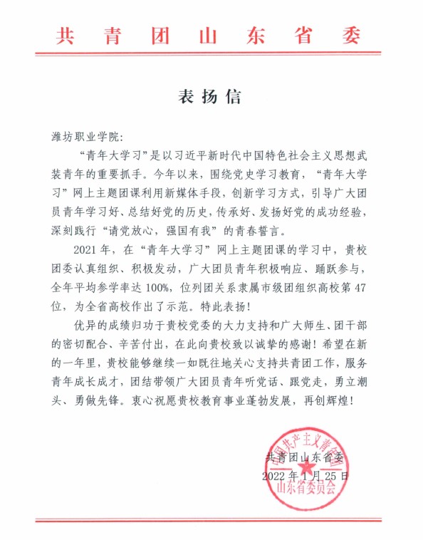 近日,天行体育官方网站收到共青团山东省委发来的表扬信,对我院2021年度“青年大学习”网上主题团课学习中取得的优异成绩进行表扬。
