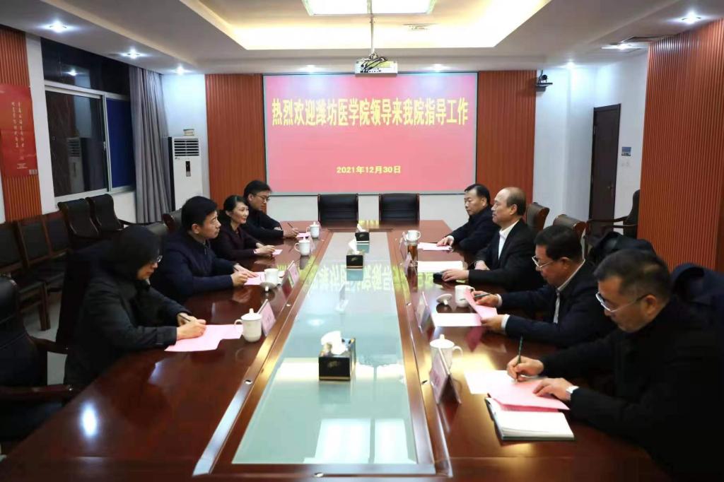 12月30日下午,潍坊医天行体育官方网站党委书记李明、院长管英俊一行4人来我院指导工作。天行体育官方网站党委书记马跃启,党委副书记、副院长桑福岭,党委委员、副院长贺志强,党委委员、办公室(统战部)主任(部长)任培华陪同考察交流。