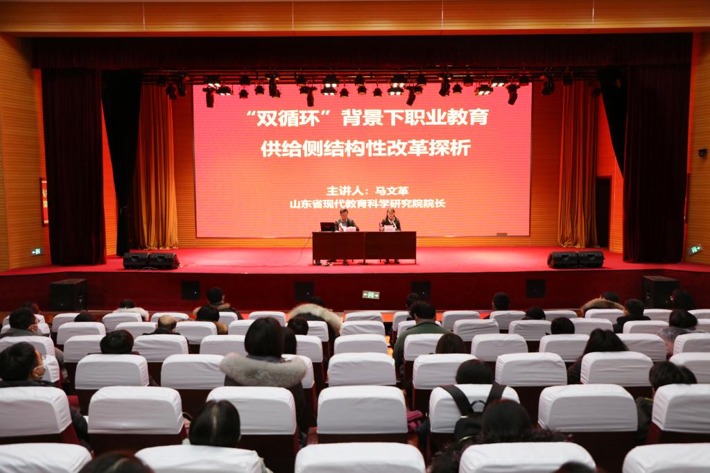 聘任仪式结束后,马文革院长在图书馆报告厅作了题为“双循环背景下职业教育供给侧结构性改革探析”的专题报告,天行体育官方网站近200名专业群卓越带头人、高水平骨干教师、杰出技术技能教师培育对象和新进教师参加了会议。马文革从职业教育“双循环”人才生态、职业教育供给侧结构性改革和职业教育未来可期三个模块进行了探析,指出职业院校要深化职业教育领域供给侧结构性改革,通过加强师资队伍建设、提升管理水平、创新评价体系、践行“三教”改革等措施,形成面向质量提升的“内循环”和面向多方合作的“外循环”。