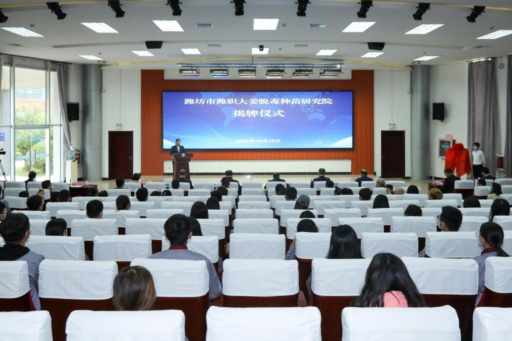 10月15日,潍坊市潍职大姜脱毒种苗研究院揭牌仪式在我院滨海校区明德讲堂举行。省农业农村厅党组成员、副厅长褚瑞云,潍坊市政府党组副书记、副市长马清民共同为潍坊市潍职大姜脱毒种苗研究院揭牌。