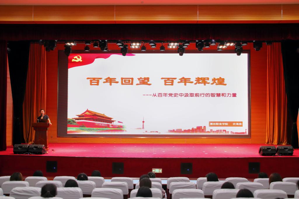 6月17日下午学校第70场人文素养讲座在滨海校区图书馆报告厅举行,思想政治理论教学部史海亮老师为同学们作了一场题为“百年回望 百年辉煌”的精彩讲座,滨海校区200余名师生聆听了讲座。