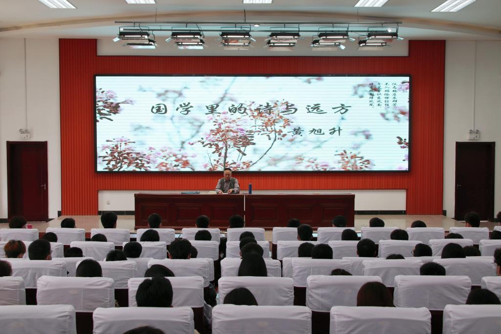 讲座共分四部分,“国学与诗意”阐述了他对国学的理解:“国学是教人做人做事的学问”。古往今来的大学问家,像苏轼、范仲淹、郑板桥等人的诗词歌赋里都蕴含着处事做人的道理,透漏出浓厚的家国情怀。“国学与立志”解读了《孟子 . 尽心上》“孔子登东山而小鲁,登泰山而小天下”的深刻含义,启发青年学生要树立远大的理想,确定人生目标,奋勇拼搏,实现人生价值。他详细的分享了诺贝尔文学奖获得者莫言自我追求理想、实现人生价值的实例,激励青年学生实现理想要“咬定青山不放松”,拼搏向前。“国学与奋斗”部分,主讲人结合莫言和自身的奋斗历程,分享了草根诗人江非的成长历程,告诫青年学生在喧嚣中学会独立思考、在困苦中磨炼成长,还要明白“生于忧患”的道理,奋斗就在当下,掌握扎实技术和本领,努力成长成才,无论将来顺逆都要泰然处之。“国学里的诗与远方”部分,主讲人说“每个人心中都有自己的诗与远方”,在“诗与远方”的道路上需要付出心血和汗水,有一点成就后要淡定与自律。最后主讲人与在场的同学们进行了亲切的互动,对同学们提出的问题进行了耐心的解答。