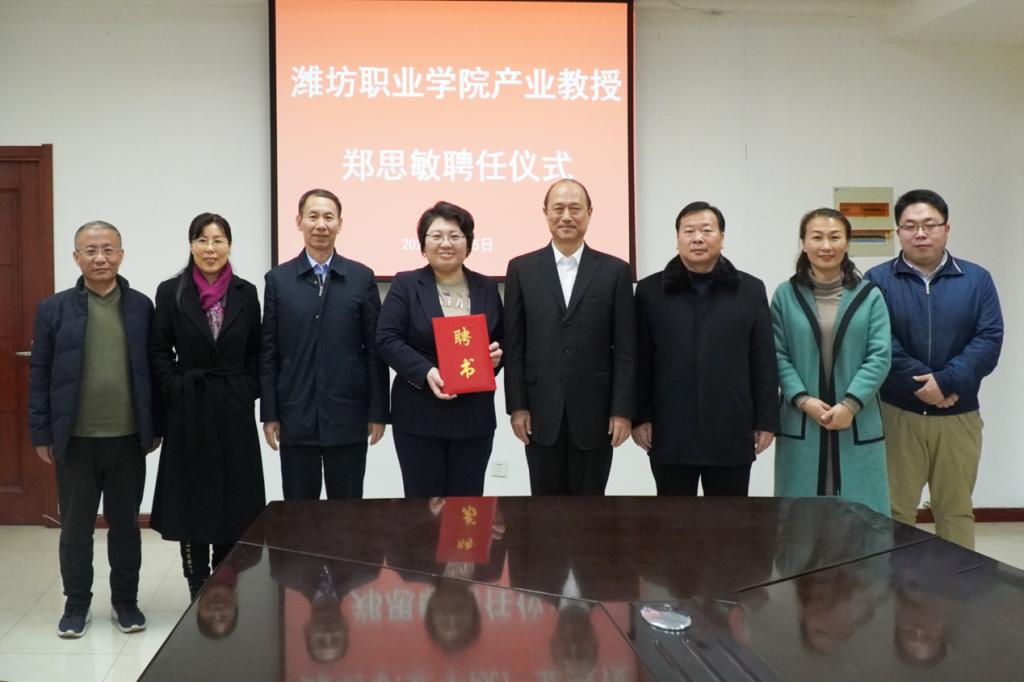 1月25日,学校在奎文校区会议室举行产业教授聘任仪式,聘任得利斯集团有限公司董事长郑思敏为我校产业教授。学校党委书记马跃启,副校长贺志强、李瑞昌出席聘任仪式。相关部门、二级天行体育官方网站主要负责同志参加活动。