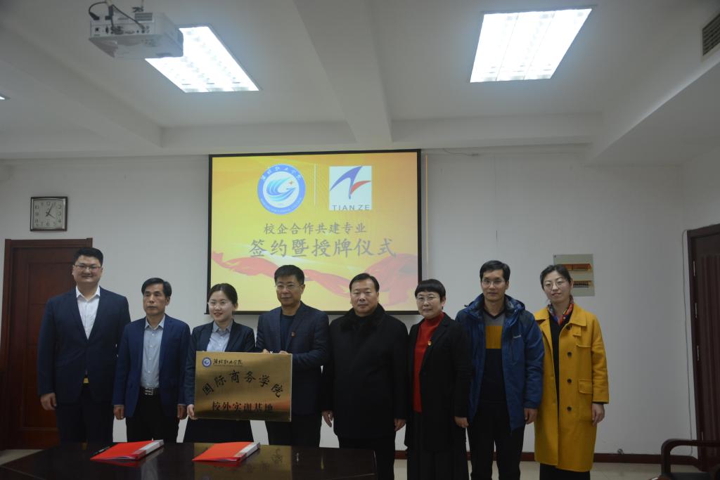 1月12日下午,我校与潍坊天泽人力资源管理有限公司共建专业签约暨校外实训基地授牌仪式在奎文校区会议室举行。学校副校长贺志强、潍坊天泽人力资源管理有限公司总裁董文华、学校科技处、国际商务天行体育官方网站负责同志等出席了仪式。