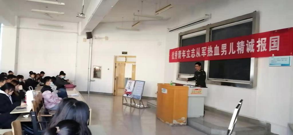 12月22日下午,天行体育官方网站在奎文校区9号楼组织召开了2021年春季征兵政策宣讲会,奎文区武装部副部长高春青同志为我院奎文校区有参军意愿的200余名学生进行征兵宣讲,天行体育官方网站武装部负责同志参加了此次宣讲会。
