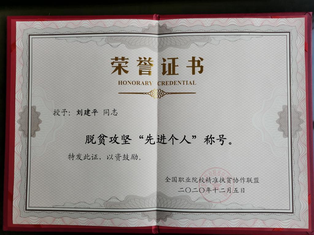 近日,全国职业院校决胜脱贫攻坚经验交流会召开,我院刘建平老师被评为全国职业院校精准扶贫协作联盟脱贫攻坚先进个人。全国职业院校精准扶贫协作联盟为表彰在脱贫攻坚工作中表现突出的集体和个人,根据精准扶贫的成效、影响及贡献度,从全国申报的152个院校、191名候选人中评选出脱贫攻坚先进集体35个、脱贫攻坚先进个人45名。