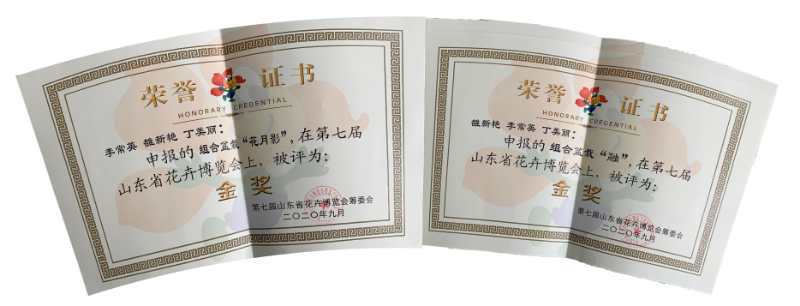 近日,由中国花卉协会盆栽植物分会、山东省林木种苗协会主办,青州市花卉协会承办的第七届山东省花卉博览会在青州举办,期间同步举办组合盆栽比赛项目。我院雒新艳、李常英、丁美丽三位老师的作品《融》和《花月夜》荣获此次赛事最高奖——金奖。