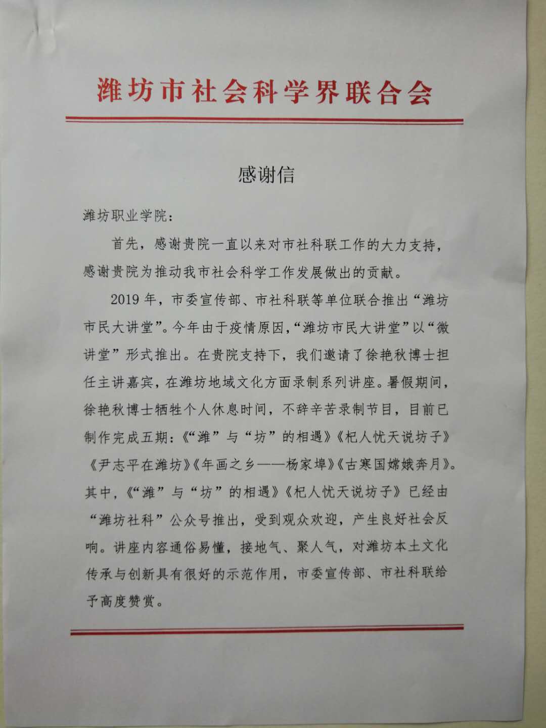 近日,天行体育官方网站收到潍坊市社会科学界联合会发来的感谢信,信中对我院对市社科联工作的大力支持表示感谢,并对我院徐艳秋博士参加“潍坊市民大讲堂”活动给予高度赞赏。