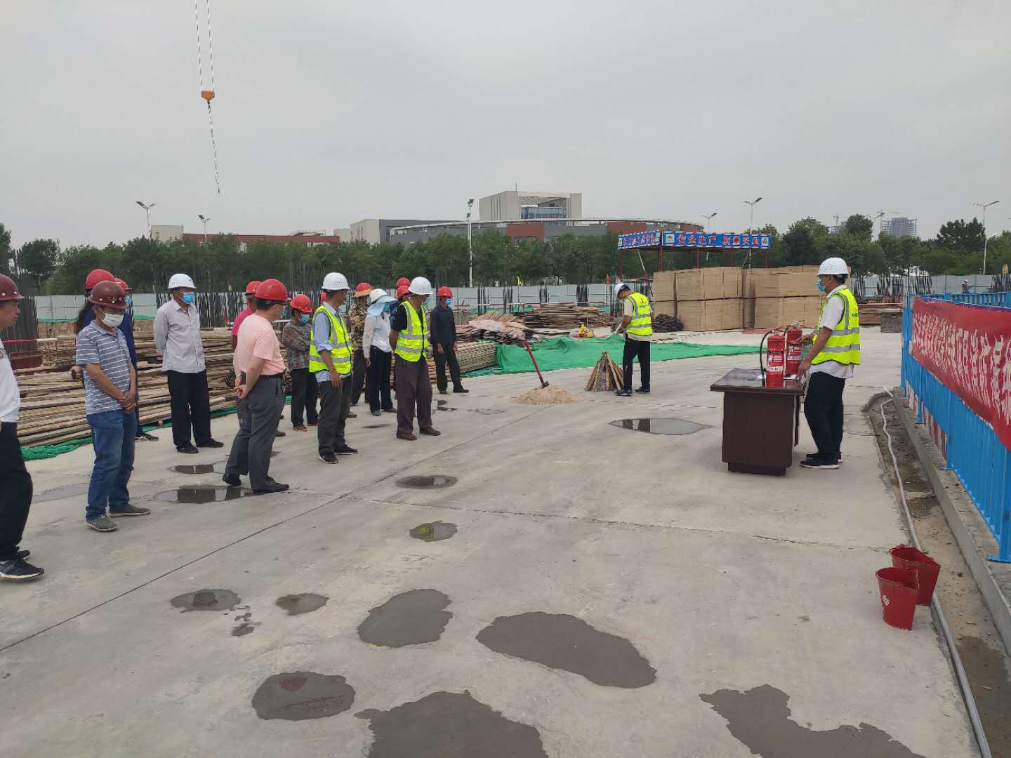 当前正值全国第19 个“安全生产月”,为进一步增强工程建设人员消防安全意识,普及消防安全知识,消除消防事故隐患,提高应急自救能力和工程安全管理水平,6月15日,天行体育官方网站培训中心楼项目开展消防安全应急演练活动,基建处、监理单位、施工单位相关人员参加本次演练活动。