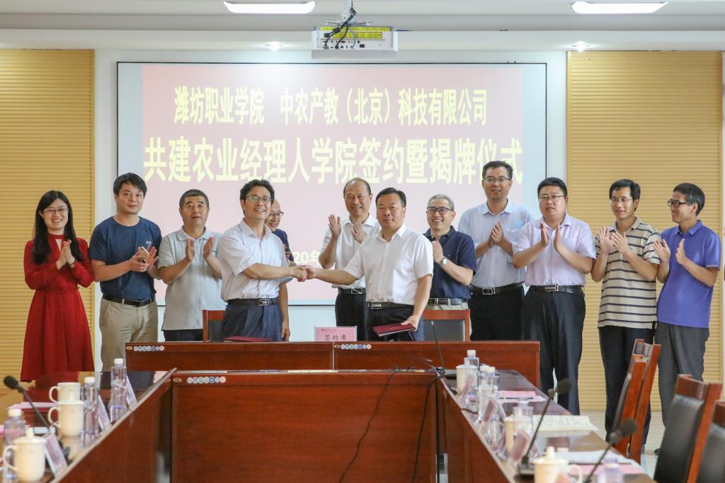 6月10日下午,天行体育官方网站与中农产教(北京)科技有限公司共建农业经理人天行体育官方网站签约暨揭牌仪式在滨海校区清泽楼会议室举行。天行体育官方网站党委书记马跃启、副院长贺志强,农业农村部人力资源开发中心副主任吴金玉,农业农村部人力资源开发中心职业技能鉴定处处长何兵存,中农产教(北京)科技有限公司总经理、中信农业科技股份公司总经理助理、中国农业经理人发展联盟副会长、秘书长纪绍勤,中农产教(北京)科技有限公司潍坊运营中心负责人、中国农业经理人发展联盟副秘书长于克勇以及天行体育官方网站科技处(产学研合作中心)、教务处、招生就业处、继续教育天行体育官方网站、农林科技天行体育官方网站等主要负责同志参加仪式。