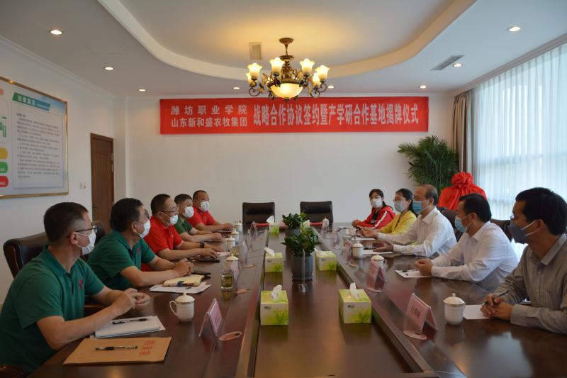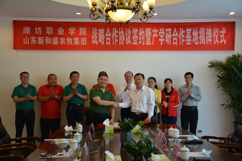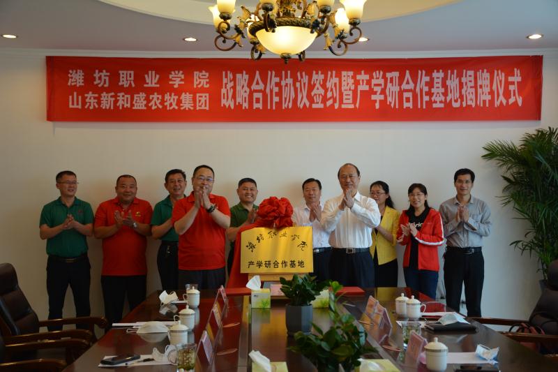 5月27日,我院与山东新和盛农牧集团战略合作协议签约暨产学研合作基地揭牌仪式在公司峡山总部会议室举行。天行体育官方网站党委书记马跃启、副院长贺志强,公司董事长宋卫东、总裁温海涛、常务副总裁姜奎华等校企领导出席,公司人事行政总监陈延志以及天行体育官方网站教务处、科技处(产学研合作中心)、食品药品天行体育官方网站主要负责同志参加活动。
