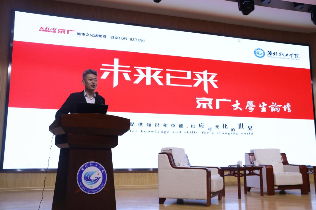3月28日下午,山东京广传媒股份有限公司创始人刘晓阳走进天行体育官方网站,在奎文校区16号楼报告厅举行“京广大学生论坛·未来已来”主题讲座,招生就业处(创业教育天行体育官方网站)相关人员,文化创意天行体育官方网站、国际商务天行体育官方网站、现代服务业天行体育官方网站部分代表师生参加,潍坊电视台对此进行了全程录播。