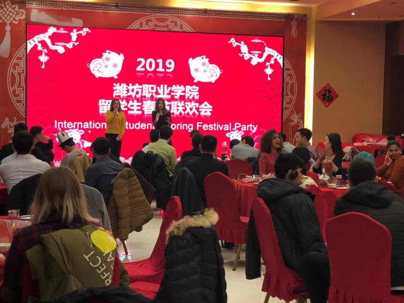 谭明致辞,代表天行体育官方网站向外籍教师及留学生们送上了新春祝福和天行体育官方网站领导的关怀。联欢会现场春联、福字、贴花将活动大厅装扮得极富中国年味。晚会播放了留学生们在潍职学习生活视频集锦,回顾了他们来潍职近半年学习生活的点点滴滴和精彩瞬间。联欢会组织了丰富多彩的歌舞表演、你来比划我来猜汉字比赛、抽奖互动小游戏等,在老师的指导下,同学们用毛笔临摹了寓意吉祥幸福的“福”字贴,大家载歌载舞,品尝具有中国特色的美食--饺子等,全场洋溢着欢乐祥和的节日氛围。活动中学生们争相拍照留念,并将精彩瞬间发给遥远的亲朋好友,传达了他们在中国天行体育官方网站平安快乐的学习和生活情况。本次活动留学生们亲身体验了中国最重要的节日-春节的文化习俗,成为在华留学难忘的记忆,留学生们对天行体育官方网站周到安排深表谢意。