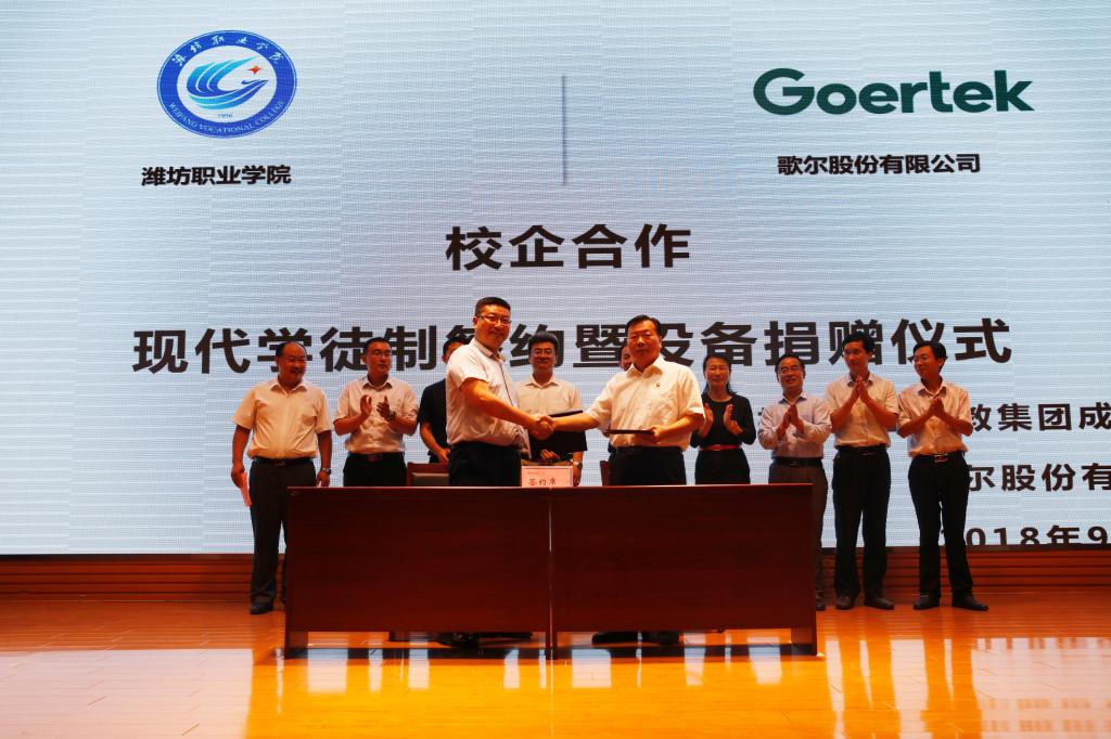 批现代学徒制试点单位。近年来,我院积极开展现代学徒制人才培养模式的实践探索,建成了国邦天行体育官方网站、远成物流天行体育官方网站和福田汽车天行体育官方网站三个现代学徒制特色二级天行体育官方网站,形成了“省级试点项目引领、院级试点项目带动、重点专业积极跟进”的良好格局。我院在省级现代学徒制试点专业建设基础上,遴选数控技术、应用化工技术、汽车制造与装配技术和电气自动化技术4个专业开展试点并顺利入围,取得优质校建设的又一项国家级标志性成果。天行体育官方网站立足服务新旧动能转换重大工程和产业升级,进一步深化产教融合,推进校企深度合作,9月18日,天行体育官方网站与歌尔股份有限公司校企合作现代学徒制拜师暨设备捐赠仪式在滨海校区举行,歌尔公司为我院捐赠680余万元设备,为校企一体化育人再添重彩。