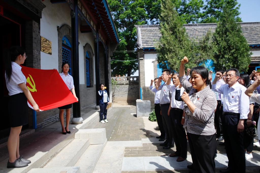 龙池镇位于山东省潍坊市东北部,革命历史悠久,红色印记众多。昌邑第一支抗日武装在这里诞生,八路军鲁东游击第七支队在这里组建,昌邑县第一届人民政府在这里成立,故龙池有昌邑“小延安”之称。全体同志首先参观了昌邑县抗日殉国烈士祠,缅怀抗日战争中牺牲的革命先烈。该烈士祠是我省建立最早的三所烈士祠之一,烈士祠守护人、昌邑市优秀共产党团员魏铁良老人介绍了烈士祠建立的背景,讲述了抗日战争时期昌潍大地上抗日军民英勇顽强的革命斗争和涌现出来的革命先烈英雄事迹,大家听了魏铁良老人的介绍,感动的热泪盈眶……全体同志在烈士祠前三鞠躬,向革命先烈致以崇高的敬意。全体党员在通识教育中心党支部书记韩春妹带领下,在烈士祠前面对党旗庄严宣誓,重温入党誓词。