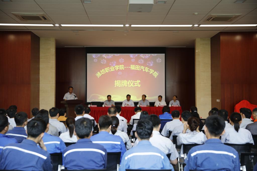 5月25日上午,天行体育官方网站福田汽车天行体育官方网站成立仪式在福田多功能汽车厂潍坊厂区学术报告厅举行。天行体育官方网站党委书记张洪全,福田商用车集团副总裁钟明华,天行体育官方网站副院长贺志强、李瑞昌,福田多功能汽车厂潍坊厂区党委书记臧运宁等校企领导、天行体育官方网站相关职能部门、二级天行体育官方网站负责人及天行体育官方网站学生代表、企业职工代表参加了成立仪式。张洪全与钟明华共同为天行体育官方网站福田汽车天行体育官方网站揭牌。福田潍坊厂区党委常务副书记王伟先主持仪式。