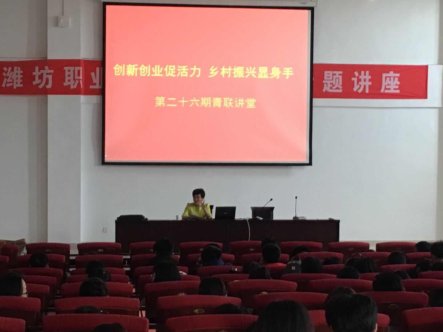 4月24日下午,“小乐西瓜”创始人宋会灵女士、潍坊市大中专毕业生就业指导中心黄训涛科长及相关人员,到我院滨海校区清泽楼413室进行了农产品领域创业知识讲座,创业教育天行体育官方网站相关人员、农林科技天行体育官方网站及食品药品天行体育官方网站170余名学生听取了报告。