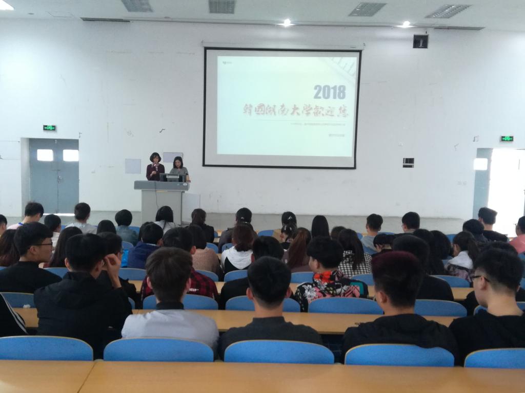 会谈后,孙皖怡一行与我院汽车工程天行体育官方网站、经营管理天行体育官方网站、农林科技天行体育官方网站、食品药品天行体育官方网站和国际商务天行体育官方网站的师生见面交流,向同学们详细介绍了到韩国湖南大学学习的优势并解答了学生提出的问题。