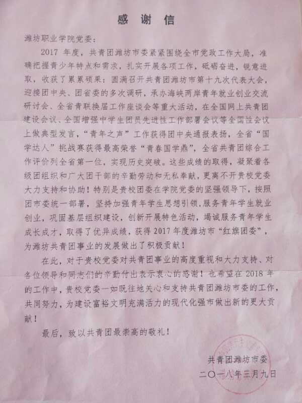 3月9日,共青团潍坊市委十九届二次全委(扩大)会议表彰了2017年度全市共青团工作中涌现出的优秀单位和先进典型。我院团委被评为2017年度潍坊市“红旗团委”,刘志艳同志荣获2017年度“潍坊市优秀青年工作者”称号,隋鹏同志荣获2017年度全市共青团系统宣传信息工作“先进个人”称号。