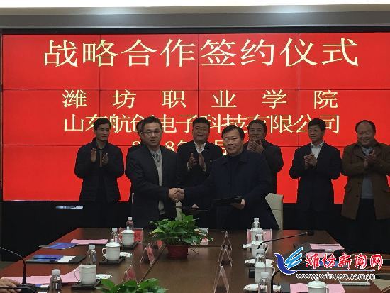 贺志强与山东航创电子科技有限公司董事长梁旭代表校企双方正式签署战略合作协议。双方将在专业共建、师资队伍共建、产学研合作、学生实习就业等方面加强合作。先期将共同组建“无人机应用技术”订单班、共建“山东航创无人机组装实训室”,后期将推进混合所有制二级天行体育官方网站建设。