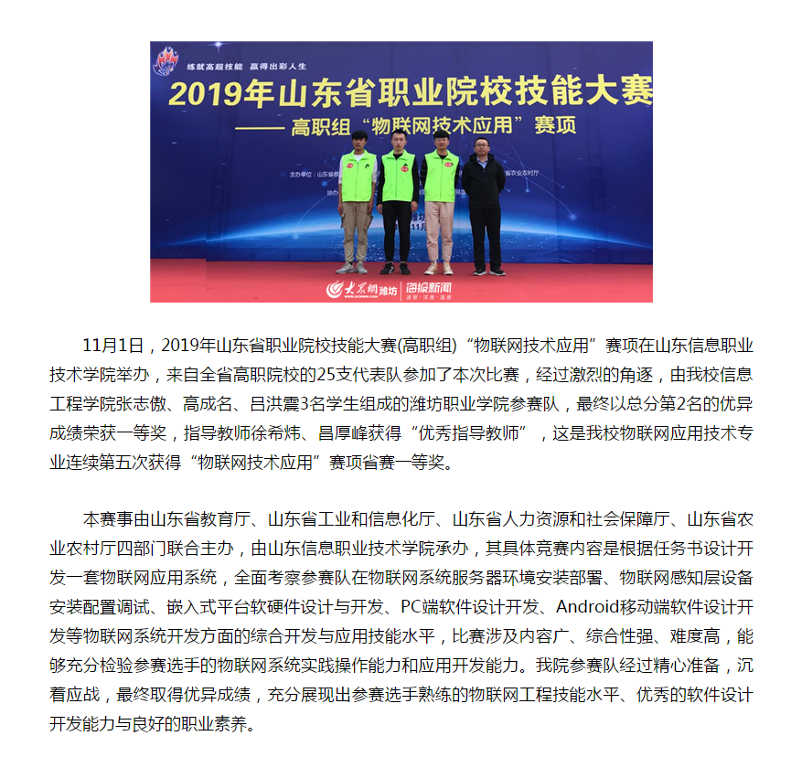 [大众网]天行体育官方网站获2019年山东省职业院校技能大赛“物联网技术应用”赛项一等奖