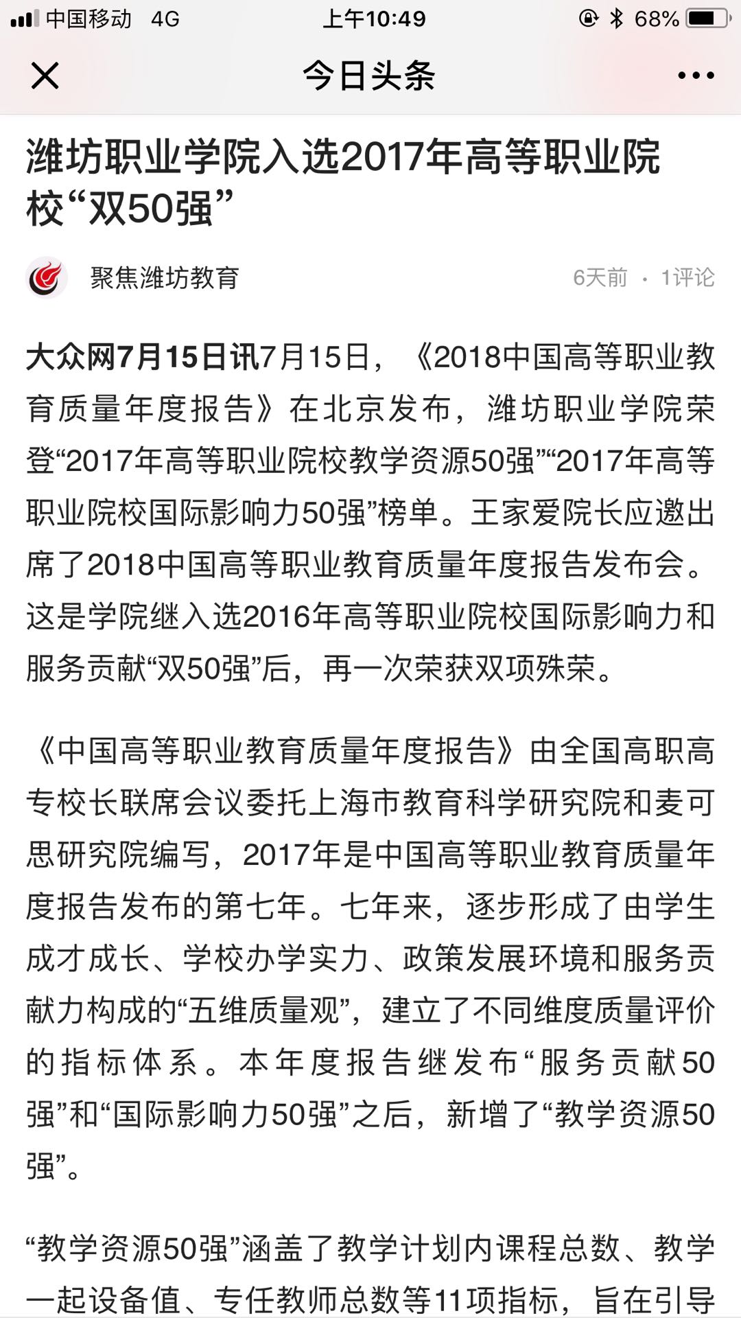 [今日头条]天行体育官方网站入选2017年高等职业院校“双50强”