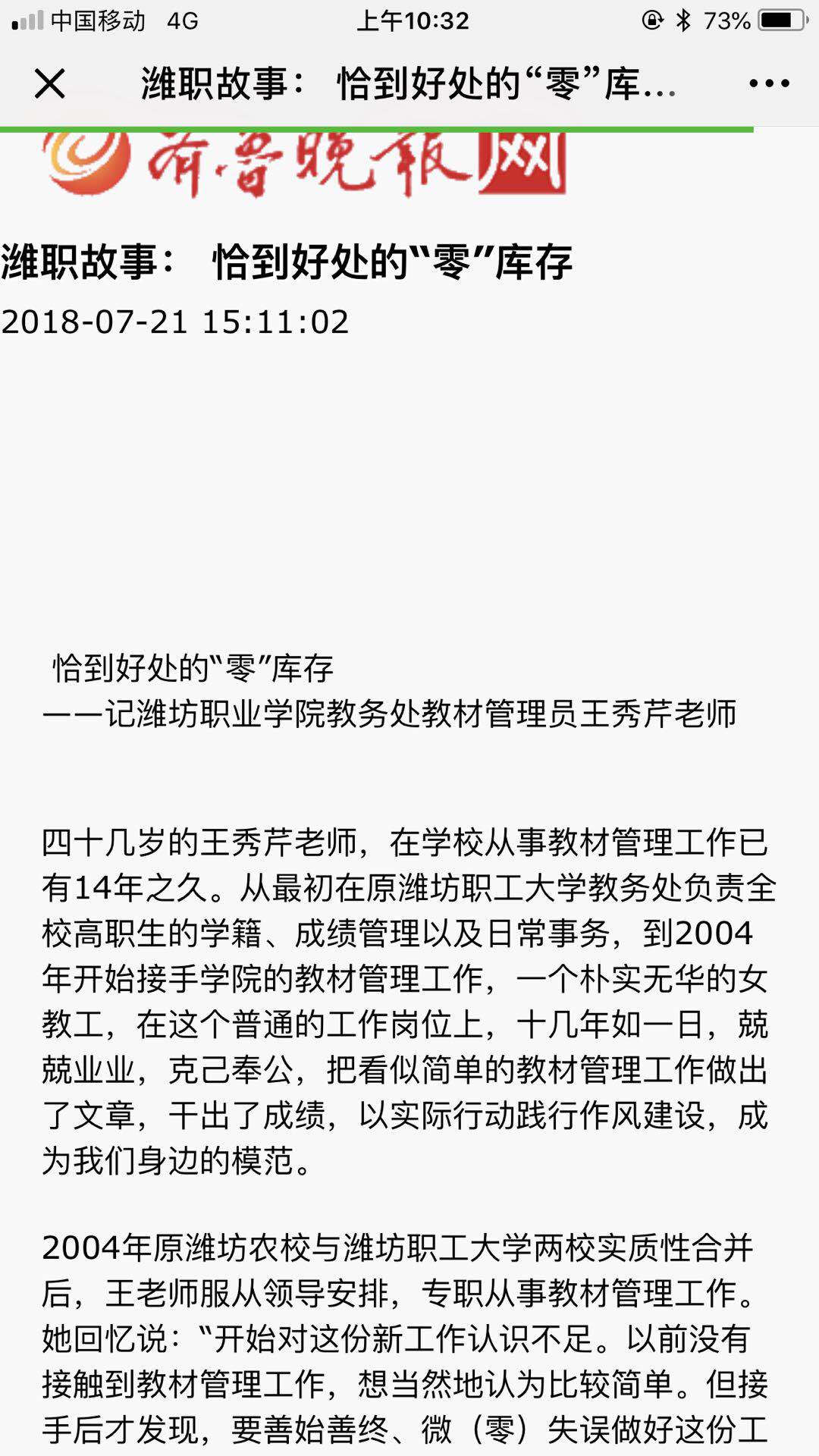 [齐鲁晚报]潍职故事:恰到好处的“零”库存——记天行体育官方网站教务处教材管理科王秀芹老师