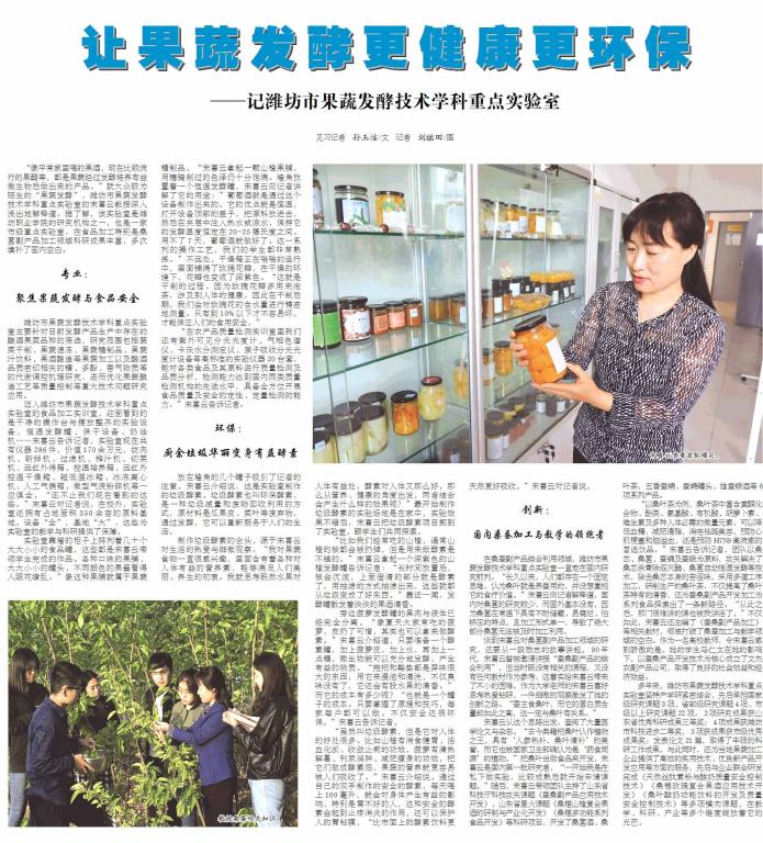 多年来,潍坊市果蔬发酵技术学科重点实验室坚持产学研紧密结合,先后承担国家级研究课题3项、省部级研究课题4项、市级以上研究课题22项。2项研究成果获山东省优秀科研成果三等奖;4项成果获潍坊市科技进步二等奖,3项获成果获市级优秀成果奖;发表论文21篇,取得了丰硕的科研工作成果。与此同时,还为当地果蔬加工企业提供了高效的实用技术、优良新产品开发应用等方面的服务,先后与企业联合研发完成《天然丝肽素粉与酸奶质量安全控制技术》、《桑椹玫瑰复合果酒应用技术开发》《桑叶酸奶功能饮料的开发及质量安全控制技术》等多项横向课题,在教学、科研、产业等多个维度绽放着它的光芒。