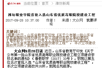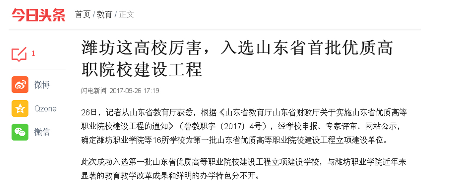 近日,山东省教育厅公布第一批山东省优质高等职业院校立项建设工程,我院以第五位名次首批入选“山东省优质高等职业院校建设工程”,潍坊日报、潍坊电视台、齐鲁晚报、今日头条、齐鲁网、大众网、潍坊传媒网、潍坊新闻网、滨海日报等多家媒体作了多角度宣传报道,彰显了天行体育官方网站显著的教育教学改革成果和鲜明的办学特色,向全省全国展示了我院职业教育发展新成就。