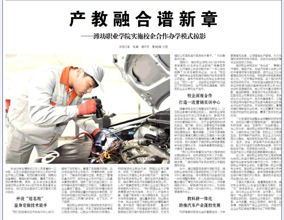 “汽车工程天行体育官方网站始终秉承以服务为宗旨、以就业为导向的办学理念,积极推进校企联合办学,根据企业用工需求,采取‘订单培养’、‘冠名班’模式,先后与北汽福田山东多功能汽车厂、潍坊瑞驰汽车系统有限公司、潍坊玄武汽车集团公司、潍坊璟和丰田汽车销售服务有限公司、山东广潍集团有限公司等大企业签订联合办学或委托办学协议。我们根据企业人才培养需要进行定向培养,优化了人才培养方案,完善了教学做一体化课程体系,校企双方共同实施教学,通过量身定做,校企联合办学,毕业生实现了与就业岗位的零距离对接,其中组成‘福田海外服务班’,重点对英语和拖拉机、汽车维修进行培训,培养出能够独立进行海外服务的技术能手,已成为福田公司首批海外服务技术骨干。”汽车工程天行体育官方网站党支部书记刘如春介绍说。
