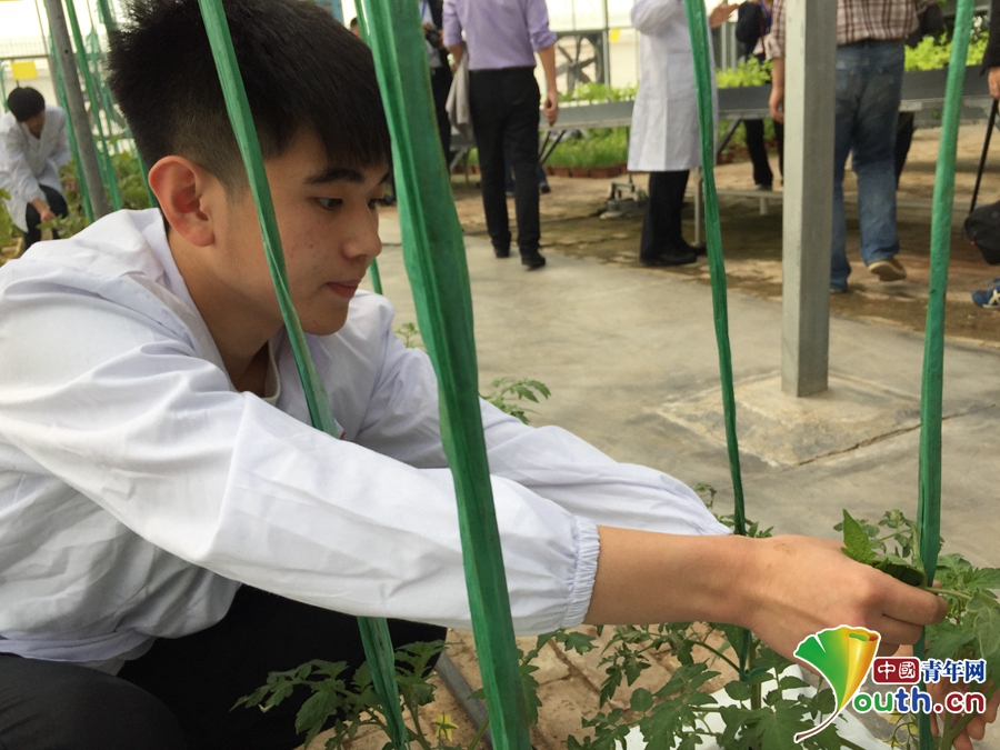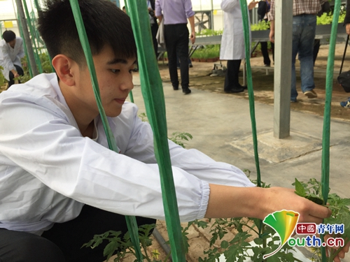 4月21日上午,由30余家媒体组成的“职业教育看山东”采访团来到天行体育官方网站,图为学生在温室大棚里育种蔬菜。中国青年网记者 王龙龙 摄