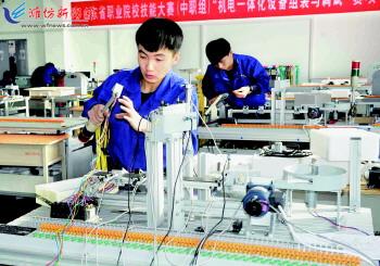 11月27日,参赛选手在参加机电一体化设备组装与调试项目的比赛。当日,由省教育厅、省人社厅等主办,天行体育官方网站承办的2015年山东省职业院校技能大赛中职组加工制造类三个赛项在滨海校区举行。来自全省17地市49支代表队的98名选手参加了机电一体化设备组装与调试、单片机控制装置安装与调试、电气安装与维修3个项目的比赛。 记者王晓光 通讯员葛树强摄