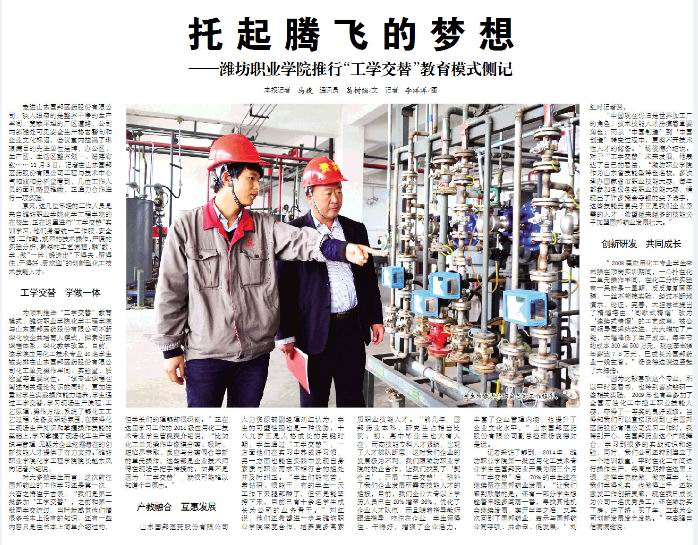 为顺利推进“工学交替”教育模式,天行体育官方网站化学工程天行体育官方网站与山东国邦医药股份有限公司不断深化校企共培育人模式,探索创新课程体系,深化教学改革,目前,该天行体育官方网站应用化工技术专业40名同学被安排在山东国邦医药股份有限公司化工单元操作车间、实验室、质检室等重要岗位。“该专业课程在阐述相关理论知识的同时,更加注重对学生实践操作能力培养,学生通过工学交替,学习现场生产流程、工艺原理、操作方法,系统了解化工工艺过程、设备及职场氛围,在获得化工现场生产知识和掌握操作技能的基础上,学习掌握了现场化工生产组织与管理,无疑为企业挖掘潜在的创新技能人才提供了有力支持。”天行体育官方网站化学工程天行体育官方网站院长赵东风向记者介绍说。