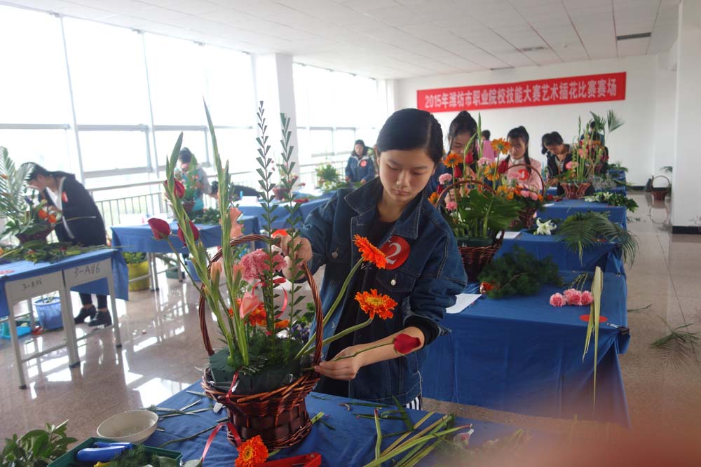 1日,由潍坊市人民政府主办,天行体育官方网站承办的2015年潍坊市职业院校职业技能大赛加工制造、农业技能比赛在天行体育官方网站滨海校区鸣锣开赛,来自全市21所中职院校的26支代表队、4名教师与115名学生就艺术插花、种子质量检测、电子产品装配与调试等6个项目展开角逐。图为教师和学生就艺术插花项目同台竞技。