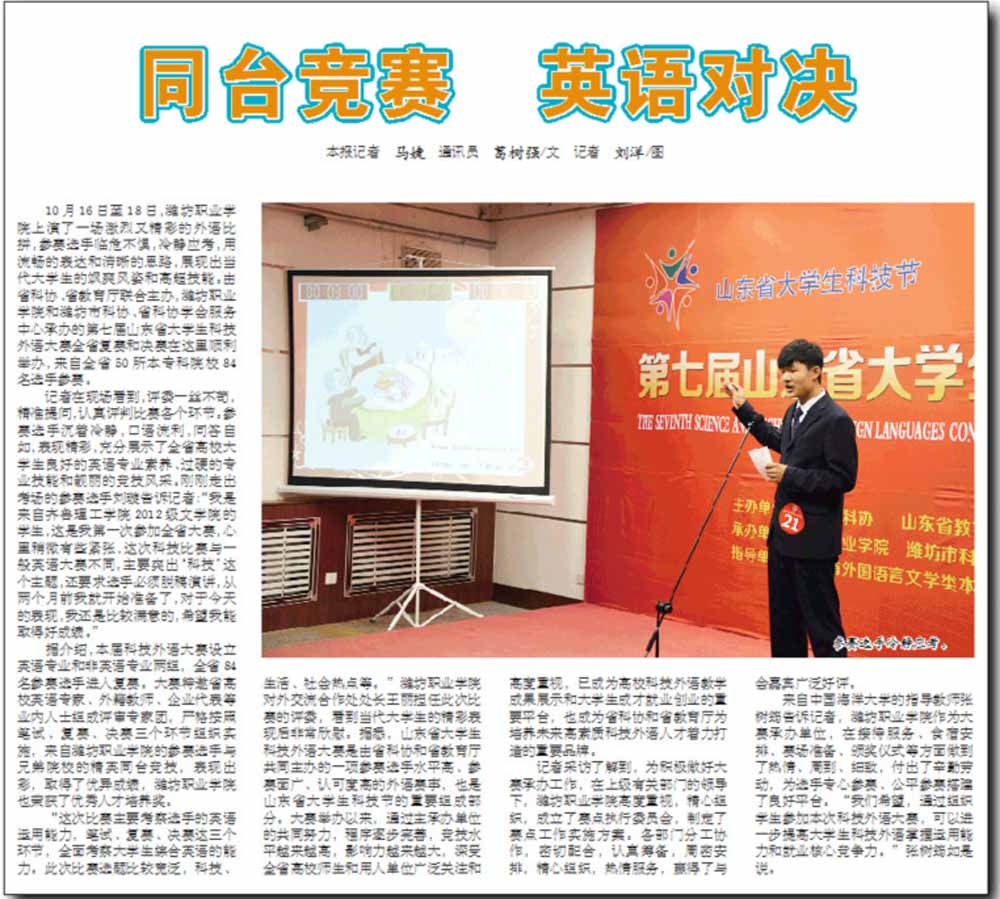 10月16日至18日,天行体育官方网站上演了一场激烈又精彩的外语比拼,参赛选手临危不惧,冷静应考,用流畅的表达和清晰的思路,展现出当代学生的飒爽风姿和高超技能。由山东省科协、省教育厅联合主办,天行体育官方网站和潍坊市科协、省科协学会服务中心承办的第七届山东省大学生科技外语大赛全省复赛和决赛在这里顺利举办,来自全省50所本专科院校84名选手到会参赛。
