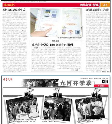 9月2日,我院4000余名2012级新生报到入学。潍坊晚报、齐鲁晚报等媒体对此作了报道。